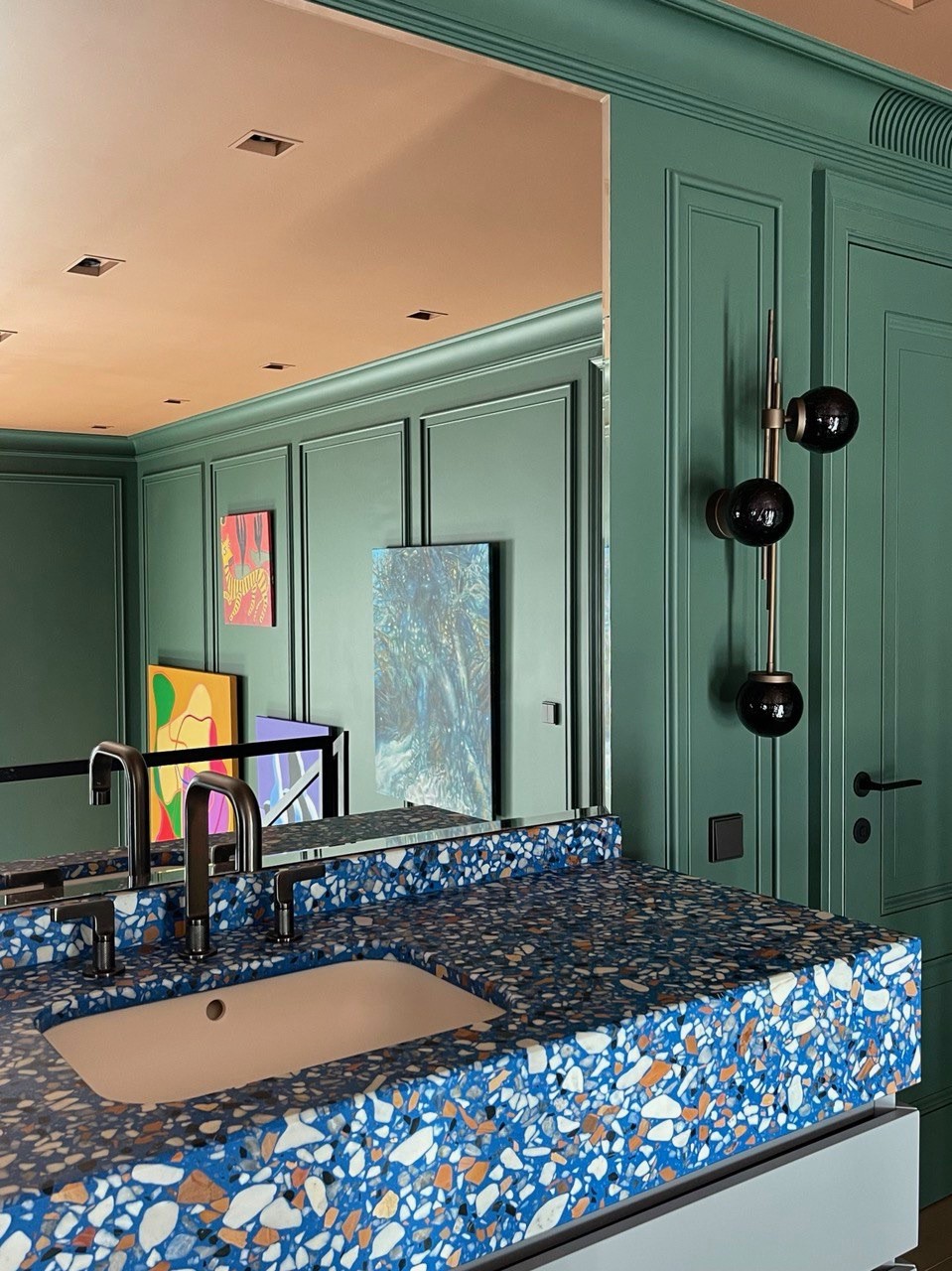 Синяя столешница под раковину с белой мраморной крошкой в ванной комнате в ЖК Футурист в СПб.