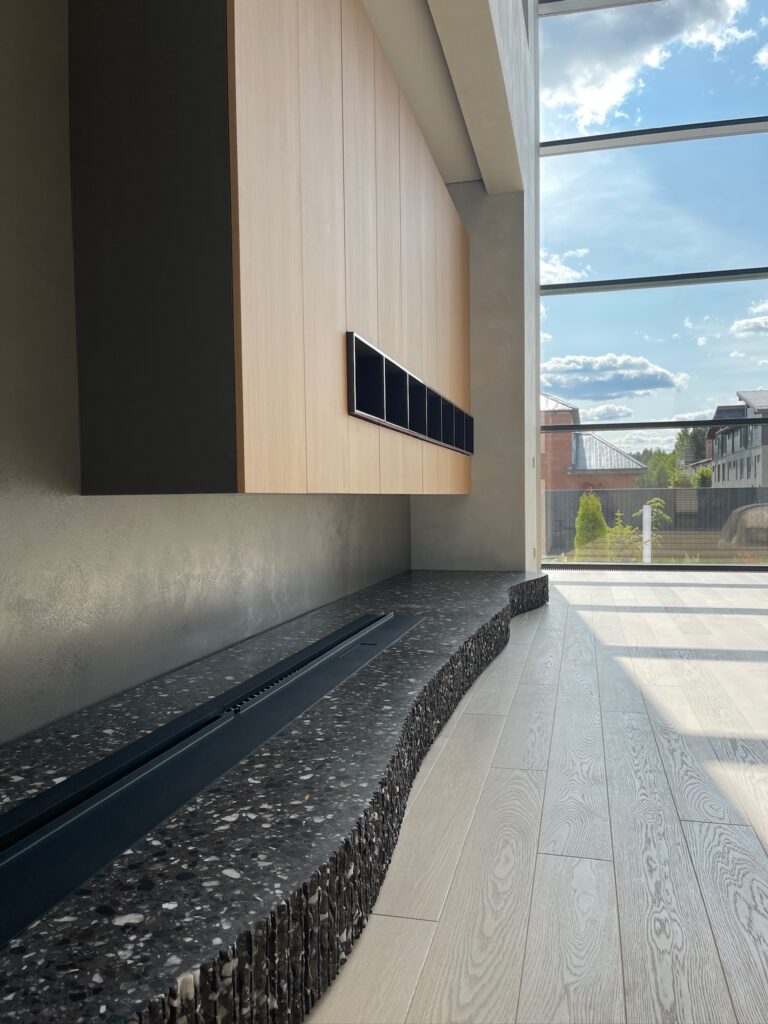 Раковина из бетона терраццо бежевого цвета с крупным камнем и травертином, длиной 2,5 метра в квартире в ЖК Медный в Москве.