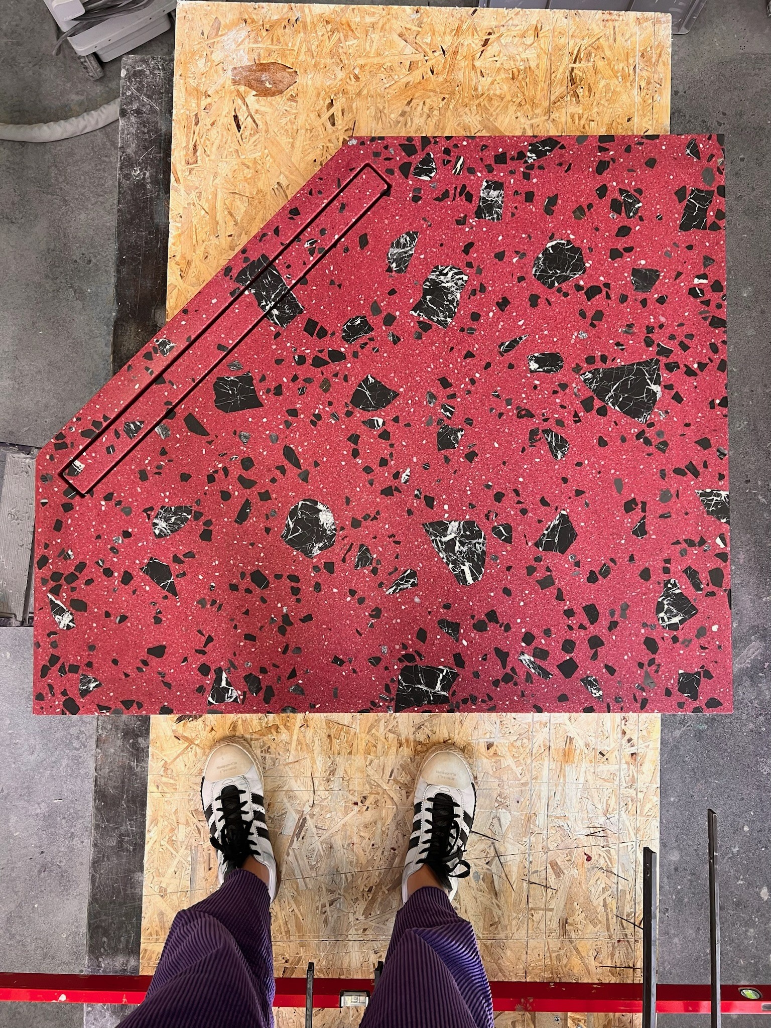 Наше решение для использованиея модели Порше в кухонной столешнице террацо в офисе компании в Берлине.