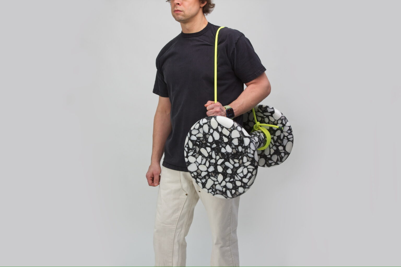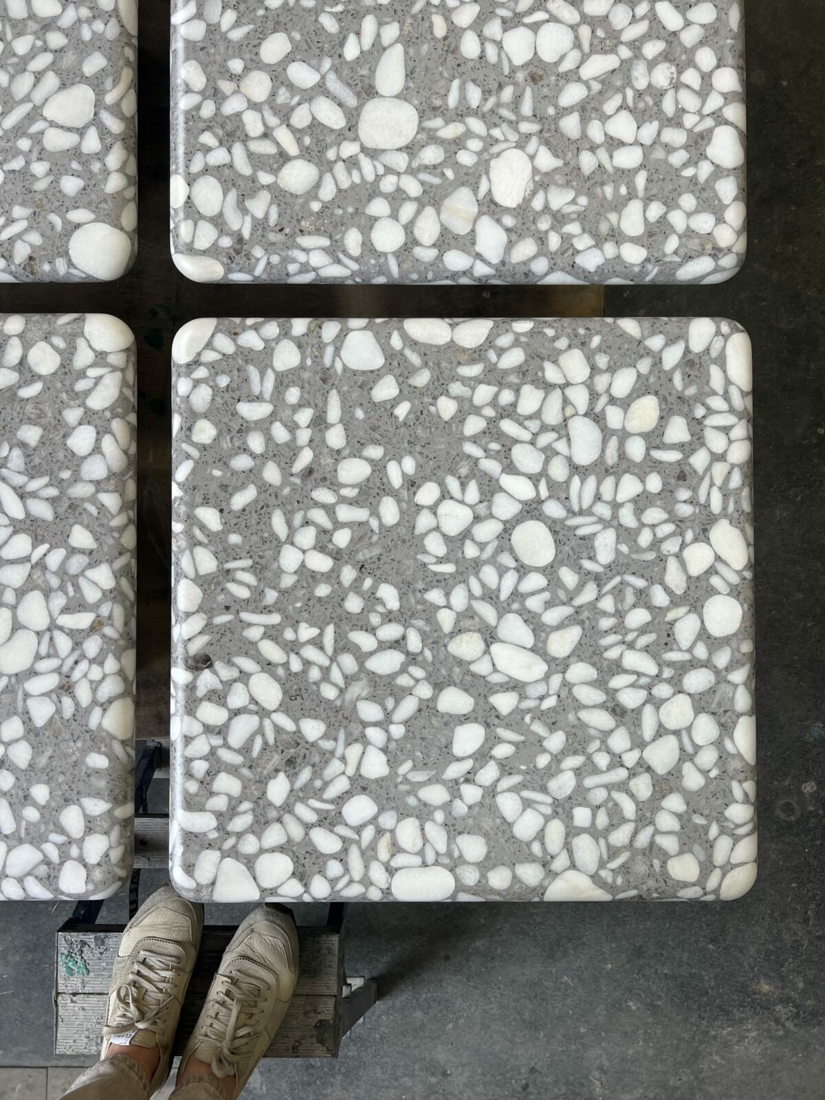 Натуральный террацио стол Monoroto с заполнитем из природного булыжника во внешней среде. Выглядит долговечно :)