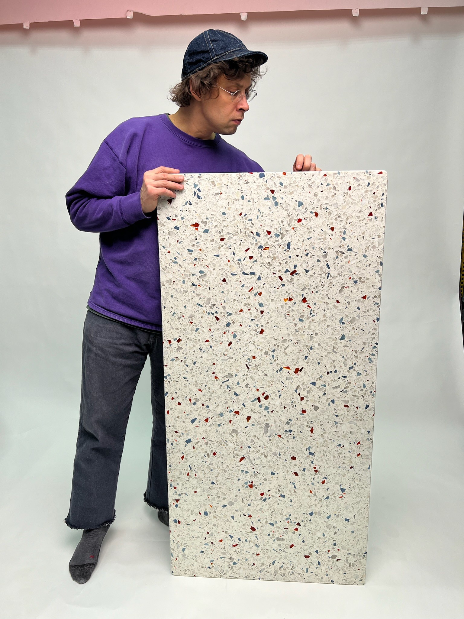 Натуральный терраццо — это материал с рисунком из цемента, пигментов и каменного заполнителя. Все свои образцы мы изготавливаем сами по зову сердца или вашим заданиям на своем производстве. Мы первыми в России стали делать цветные смеси терраццио не очень типичных, местами удивительных оттенков, даже по мировым меркам. Наши дизайны терраццо — сочетания цветов бетона и камней — постоянно копируют, получается плохо, но не будем о грустном. Технологий, материалов и фактур у нас очень много, они все время плодятся, потому что стандартного у нас ничего нет (как и каталога текстур) и всё делается под заказ. Знающие дизайнеры этим пользуются, и вы тоже можете заказать :)