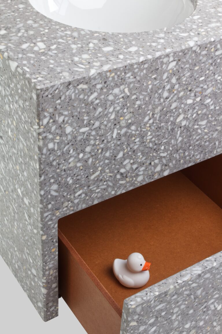 Розовая накладная раковина терраццо с крышкой слива из оникса в ЖК Brodsky в Москве.