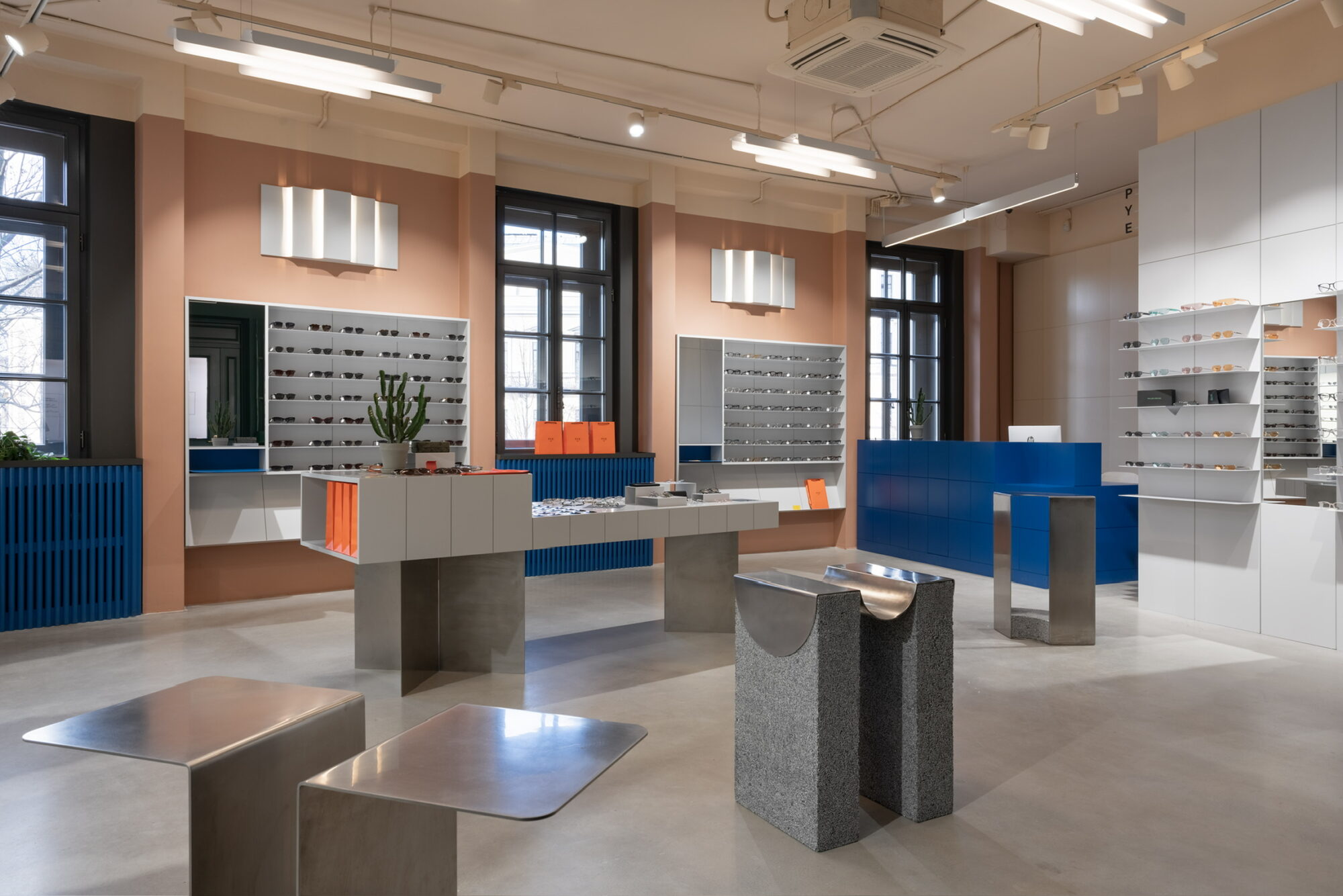 Серые терраццо кубы для яркого магазина. Основание оклеено войлоком.